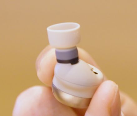 竹重 進化点は他にもあって、ノイズキャンセリングに必要なフィードバックマイクの位置も大幅に変更しました。従来は、ドライバーの前側に付いており、それにより筐体が少し膨らみがちでした。EAH-AZ100では、フィードバックマイクを内部のチューブに入れ込むことで、ドライバー周りがすっきりして、耳のくぼみに入る部分がスマートな形状になりました。ノイズキャンセリングの性能向上にも寄与しています。