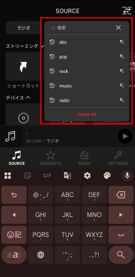 1-1. SOURCE画面からの検索 ストリーミングサービスで素早くお好みの曲を選択できるよう、キーワード検索を行える機能です。
